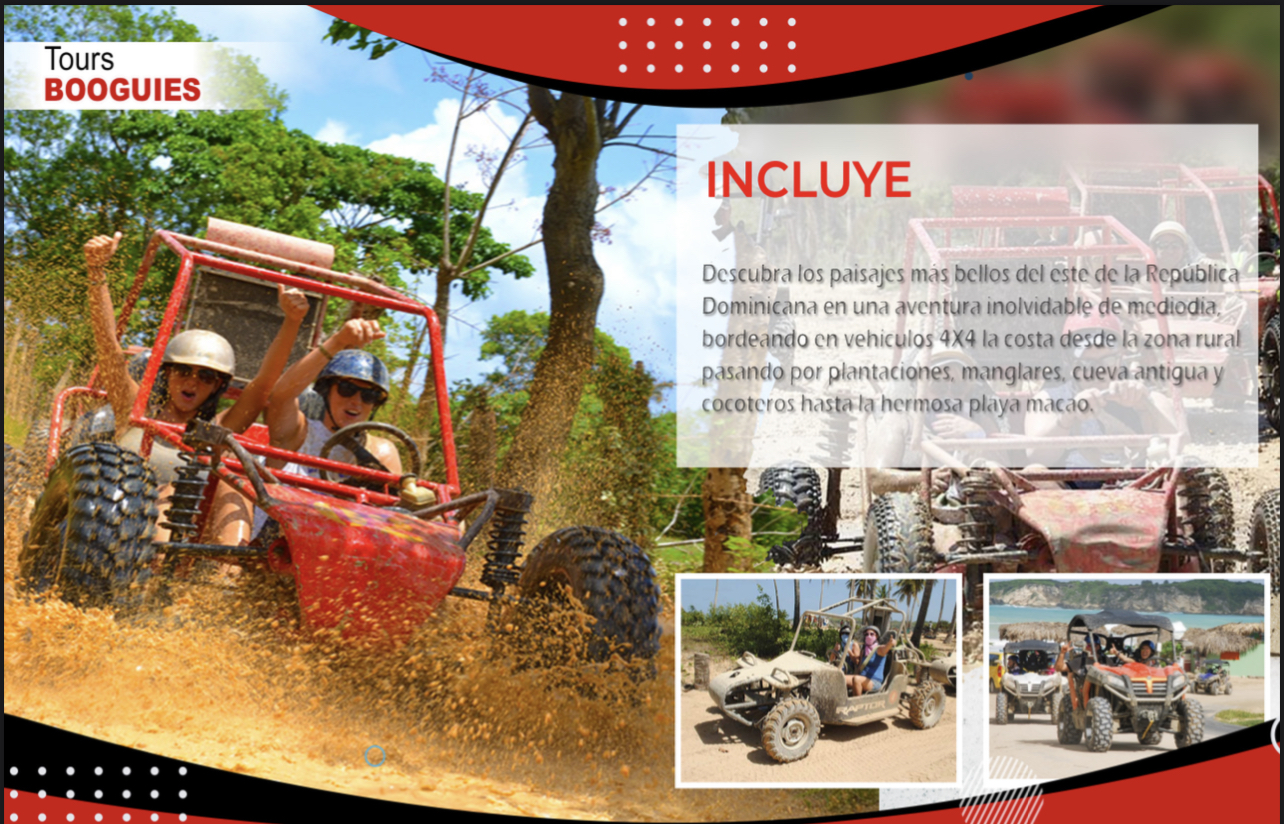Drive your own buggy, exiting off-road routes across the beach, mud and specified paths for an adrenaline rush with exiting stops at Native Taino caves and stops at the surfer beach Macao, coffee farms and much more ..If you are looking for an adventurous and interactive day out, this will be it.
